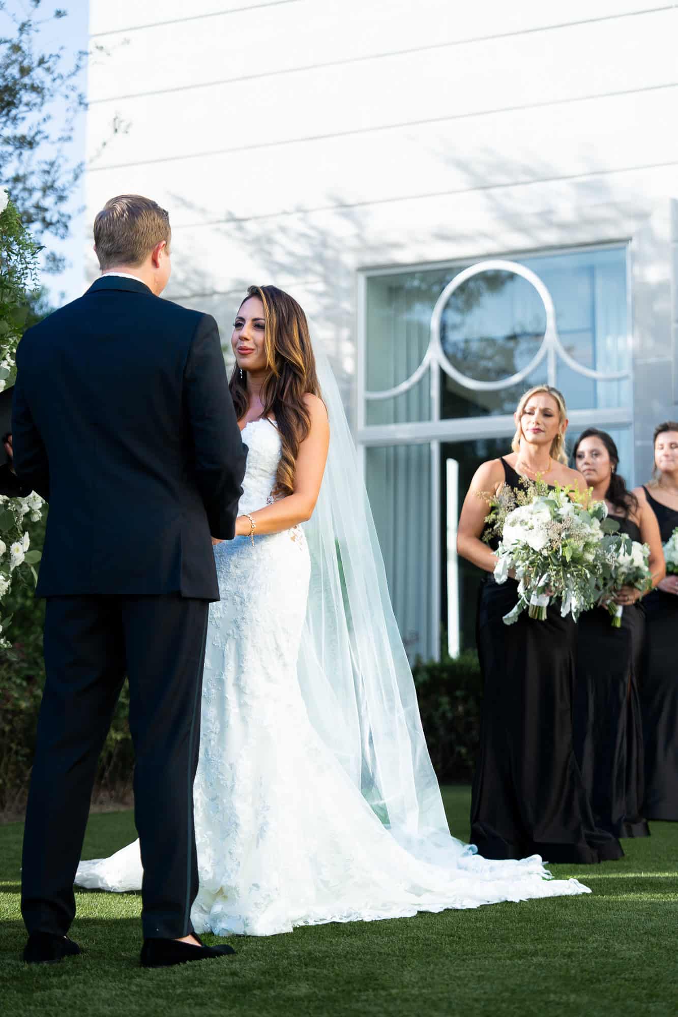 The groom sees his bride walking down the aisle and sheds tears of joy
